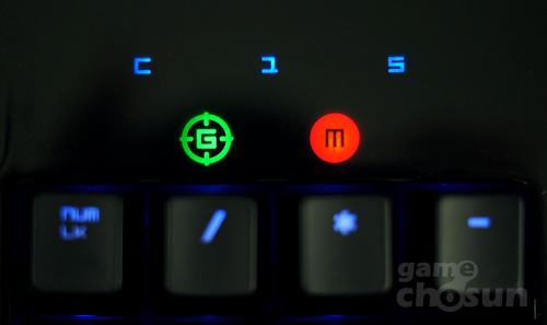 키보드 우측의 키패드 위에는 키보드 상태를 나타내는 인디케이터를 볼 수 있는데, C는 캡스락, 1은 넘락, S는 스크롤락 키의 On/Off 상태를 알려주며, 게이밍모드를 나타내는 녹색의 G마크와 매크로 상태를 나타내는 M마크가 표시된다.