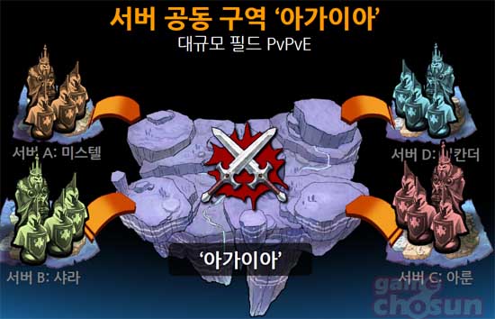 연말에는 PvP와 PvE가 동시에 이뤄지는 아가이아가 업데이트 되면서 서버 VS 서버의 대립구도가 완성형의 모습을 갖추게 된다. 최고레벨에 도달한 유저들은 모든 서버가 함께 사냥할 수 있는 지역인 아가이아에서 플레이하게 되고, 각 서버의 영주들은 자신의 서버 유저들을 보호하기 위해서 다른 서버 유저들과 전쟁을 하게 된다. 이때 타 서버로의 침공도 가능하다.