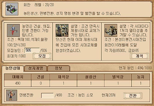 농민은 모집가능한 농민의 최대수를 늘려주는 주택 건물을 건설, 레벨업한 후 회관에서 모집할 수 있다. 농민을 얼마나 잘 활용하느냐에 따라 제국의 발전속도가 달라질 것이다.