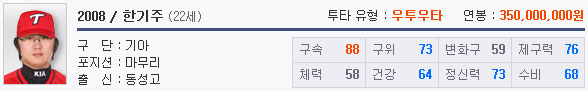 아직 2011년 한기주를 예상하기에는 이른 감이 있지만, 그의 명성에 맞는 실력을 보여주고 많은 팬의 사랑을 받고, 야구9단에서도 좋은 능력치를 가진 선수로 나와줬으면 한다.