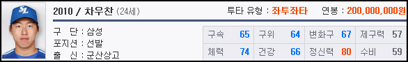 어린 나이임에도 제구력과 수비력이 낮은 것만 빼면 구속, 구위, 변화구 수치가 높다. 좌완투수라는 매리트와 함께 나이에 비해 높은 총 스탯은 역대 차우찬(Lv.8, 535) 중에 제일 좋은 선수다.