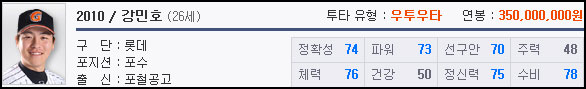 올스타 포수인 강민호는 게이머들 사이에서도 인기가 높다. 우선, 능력치 상으로 건강과 주력이 낮은 것만 빼면 모자란 수치가 없으며, 수비 수치가 높아 도루 저지 등 포수로서의 역할에 충실할 수 있다.