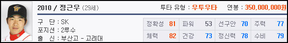 09정근우(Lv.10, 636) 가 제일 좋으며 08정근우(Lv.9,603)와 10정근우(Lv.9,596)으로 레벨이 같다. 높은 주력과 정확으로 다양한 작전에 적합하다.