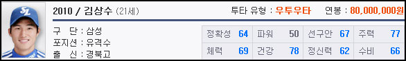 21살의 어린 나이와 빠른 발이 무기인 김상수는 레벨도 낮아 육성하기 좋은 선수이다. 09김상수의 경우 5레벨로 쿠바 유학을 보낼 수 있어 높은 가격에 거래되고 있지만 10김상수는 유학보다는 즉시 전력으로 활용할 수 있다.