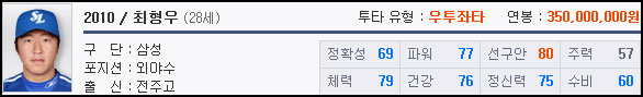올 시즌 3할이 넘는 타율로 좋은 활약을 보이고 있는 최형우는 낮은 주력이 무색할 정도로 좋은 능력치 분포를 보인다.