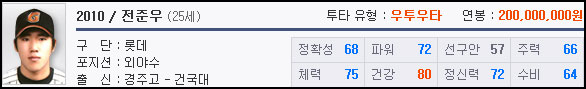 10전준우(Lv.8, 559)가 역대 전준우 중 가장 높은 레벨이며, 건강이 높아 꾸준한 활약을 기대할 수 있다.