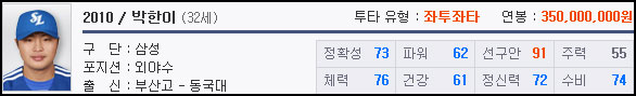 25살의 어린 편에 속하는 나이로 최형우 선수와 비슷한 능력치 분포를 가졌다. 하지만 건강이 높아 나이도 25살이라 장래가 촉망되는 선수이다.