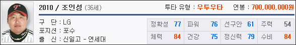 게임 내 포수 영입 시 엘지 선수로 팀을 구성하는 유저라면 조인성과 김동수를 두고 한 번쯤 고민하게 된다. 2010년 조인성은 전체 포수 중 총합계 601인 87년 이만수 뒤를 이은 두 번째로 높은 능력치를 보유하고 있다.
