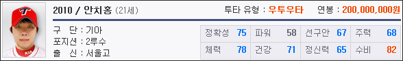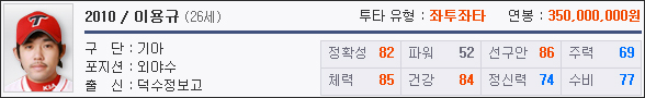 04년 엘지 소속 이용규를 제외하고는 팀인지도와 인기선수라는 강점으로 영입가격이 꽤 높은 편이며, 어린 나이에 높은 레벨의 좋은 능력치를 보유해 추천하고 싶은 외야수다.