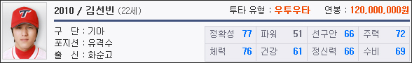 총 10명의 올스타전 선발선수 중 게임 내 가장 열악한 능력치를 가졌다. 하지만 기아팀 유저라면 나이도 어리고 FA영입 시장에 매물도 많아 한 번쯤 키워볼 만한 선수이다.