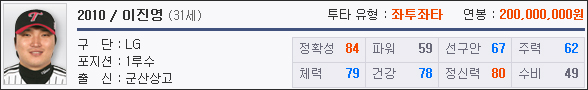 특히, 준수한 능력치를 가진 25세 이하의 이진영이 레벨5부터 10까지 고르게 분포되어 있어 유저들의 선택폭이 넓다는 장점이 있으나, 국민우익수라는 이름에 걸맞지 않게 낮은 수비력이 아쉬움으로 남는다.