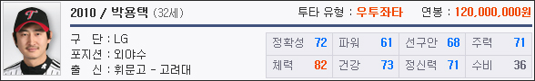 박용택의 경우, 02년이 가장 많이 선호되는 것으로 나타났다. 모든 능력치가 70대에 이르는 수치로 고르게 분포됐으며, 24세의 어린 나이이기에 제대로 키워볼 만한 선수로 약 20억 원에 영입 가능하다.