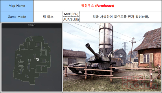 팜하우스는 러시아와 국경 지역인 폴란드 바르민스코 마주르스키 지역에서 교전이 이뤄지는 맵으로 농장 안에는 주택과 곳곳의 은폐물이 많아 몸을 쉽게 숨길 수 있다. 이런 특성상 스나이퍼가 유난히 강세를 보여 유저들에게는 다소 논란의 대상이 된 맵이다.