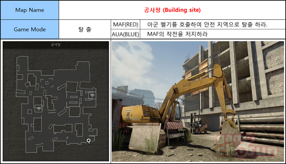 키르기스스탄의 수도 비슈케크에 위치한 마나스 미 공군기지 부근 공사현장에서 진행되는 공사장 맵은 넓은 장소 곳곳에 배치된 은폐시설과 폭발 시 데미지 효과가 발생하는 폭파 오브젝트를 활용해 교전이 펼쳐지는 맵이다.