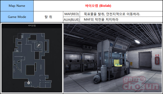 러시아 페름주 페름시 외곽에 있는 생화학무기 연구소를 배경으로 한 바이오랩 맵은 연구실의 좁은 통로와 계단을 오르내리며 펼쳐지는 전투가 인상적이며, 건물 벽을 폭파해 새로운 이동 루트를 개척해 교전하는 재미가 있다. 또한, 눈이 오는 추운 겨울 날씨를 묘사해 캐릭터가 건물 밖으로 나가면 화면에 서리가 끼는 효과가 발생한다.