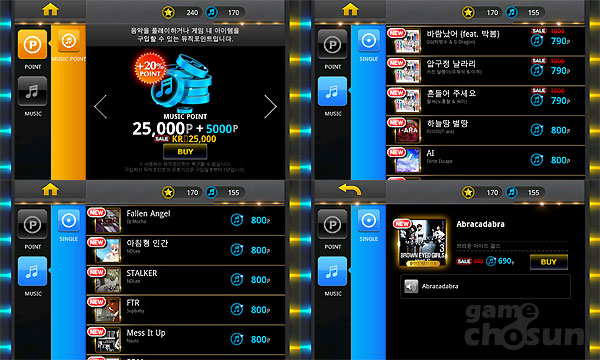 ↑ 탭소닉의 상점. 최근 인기를 끈 무한도전 가요제의 음악부터 디제이맥스 음악, 포인트 등을 판매한다.