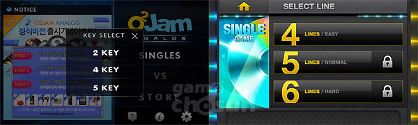 오투잼은 2키, 4키, 5키 방식 중에 고를 수 있으며, 탭소닉은 4, 5, 6라인 방식 중에 선택가능하다.