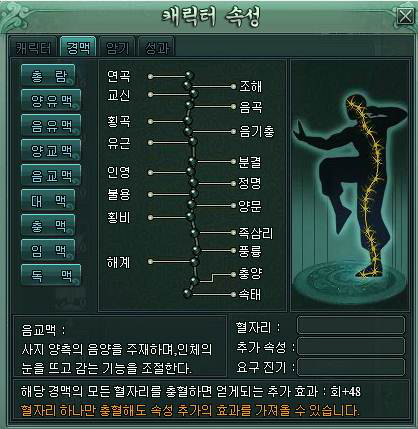 캐릭터를 강하게 키우기 위해서는 레벨, 장비, 스킬 외에도 경맥을 뚫어 공격력, 방어력, 생존능력을 강화시키는 방법이 있다. 경맥을 뚫게 되면 장비와 잠재력포인트가 상대방보다 낮아도 더 높은 공격력, 방어력, 생명력 등을 가지게 돼 PK에서도 일격필살의 공격으로 상대방을 제압할 수 있다.