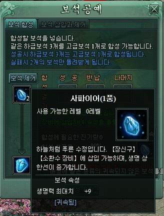 TIP : 홍보석- 공격력추가, 황마노-방어력추가, 파란수정-생명추가, 녹색비취-공격속도증가, 백진주-회피증가, 흑연옥-치명타율증가