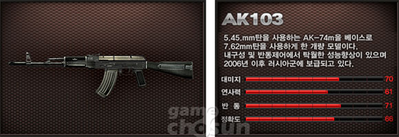 수치를 떠나 세 라이플의 조준사격 탄흔을 비교했을시 제일 높은 집탄율을 보이인 것은 AK103이다. 수치상으로는 M4A1이 집탄율이 제일 높아야 하지만 수치만으로는 알 수 없는 무엇인가가 있는 듯하다.
