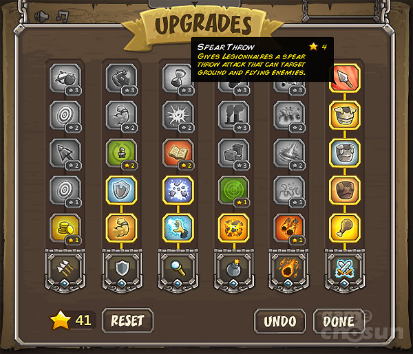 4종의 타워와 2개의 마법은 스테이지를 클리어할 때 마다 받게되는 별 포인트를 이용해 업그레이드가 가능하다. 업그레이드를 통해 보다 강력하게 성능을 올리거나, 부가적인 효과를 주도록 할 수 있어 자신이 주력으로 사용하는 타워나 마법을 특화시킬 수도 있다.(모든 스테이지에서 모드 별로 클리어를 완수하면 빠짐없이 업그레이드가 가능하다)