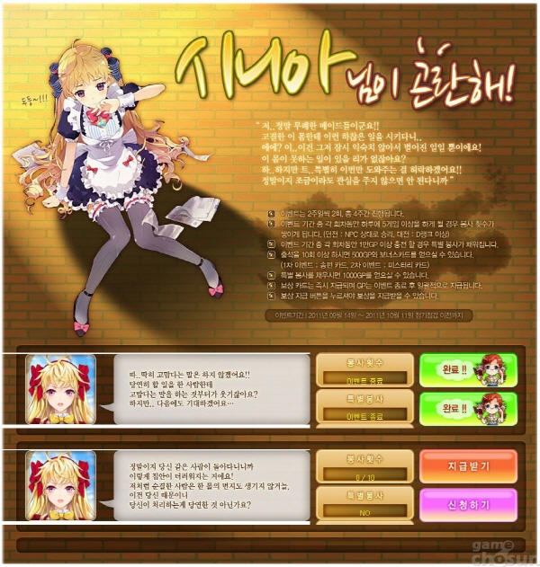 게임에 접속하면 우선 스크린 샷(이하 스샷)으로 가득한 메인화면이 눈에 들어옵니다. 다소 밋밋하다는 느낌을 가지고 이벤트 창을 클릭했습니다.