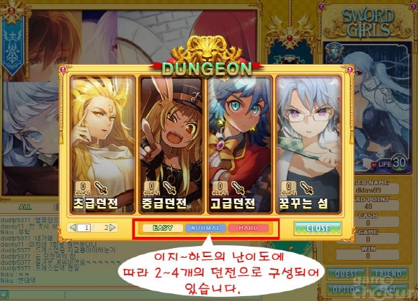 던전은 이지 ~ 하드의 난이도로 구성되어 있으며, 플레이어의 선택에 따라 입장 가능합니다.