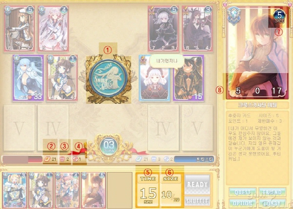 최대 SIZE는 '10'이라는 얘기고, 현재 소모한 SIZE는 '0'이란 얘기입니다. 테이블에 카드를 올리지 않았으므로 소모된 SIZE는 '0'인 것이지요. 2번(핸드)을 보시면 각 카드의 오른쪽 상단에 3,3,1,5,5 이렇게 쓰여 있는 것이 각 카드의 SIZE입니다.