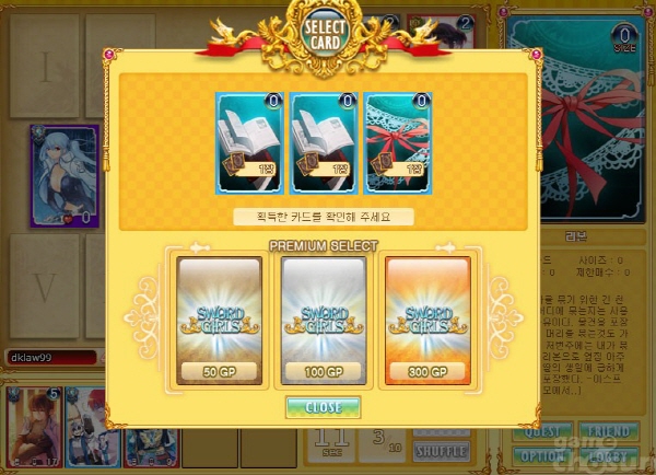 ‘소드걸스’의 카드 입수 시스템은 크게 두 가지로 나뉩니다. 직접 게임을 해서 결과물로 획득하거나 캐시(GP)가 필요한 부스터를 통해 획득할 수 있습니다.