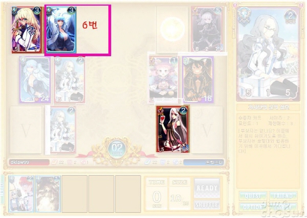 위 스샷에서 6번을 보시면 다른 카드와 달리 공격력/방어력/체력이 없습니다. 이는 스펠카드라고 하는데 배치순서와 상관없이 가장 먼저 발동하는 특징을 선보입니다.