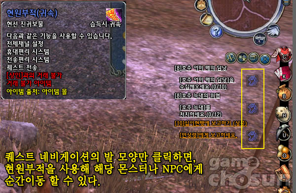 ↑ 캐쉬 아이템인 현원부적을 소지하고 있으면 모든 퀘스트를 순간이동으로 처리할 수 있다. 회사 출퇴근에도 현원부적을 살 수만 있다면... ㅠ.ㅠ