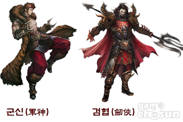 - 천하제일 용사 '군신' : 군신은 일반적으로 흔히 말하는 탱커다. 공격력이 다른 캐릭터보다 약하지만, 방어 능력에 있어서는 최고다. 유일하게 방어형 무기인 중갑을 착용할 수 있기 때문이기도 하다. 사용하는 무기는 창, 곤, 추
