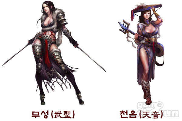 - 천하제일 음공 '천음' : 강력한 원거리 공격을 사용하는 마법사형 캐릭터다. 천음은 범위가 넓은 광역 스킬을 사용하므로 사냥에 있어서는 가장 빠른 편이다. 내력을 통해 파티원의 체력을 일부 회복시키기도 하는 보조 힐러의 역할도 담당한다. 천음은 호갑(방어 무기)을 착용할 수 없어 방어력이 약하며, 근거리 공격도 불가능하다. 사용하는 무기는 금, 비파, 적(피리)