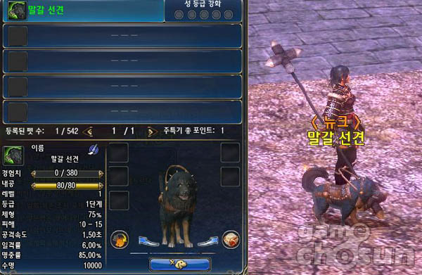 ↑ 펫은 퀘스트나 사냥시 드랍되는 아이템으로 획득 가능. 펫의 육성 포인트를 직접 투자해 스킬을 찍을 수 있으며, 함께 전투에도 참여한다.