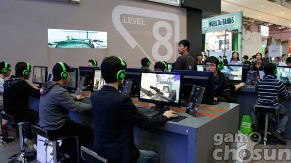 저희 NHN 부스를 보시면 이동 공간과 PC공간이 상당히 넓습니다. 몇 년간 행사를 경험하다 보니 유저들의 불편사항을 알고 이번 행사에는 유저분들이 플레이를 할 때 마우스가 옆 사람의 키보드에 부딪히거나 이동 간에 다른 관람객들과 부딪히는 부분들을 배려해 더욱더 많은 유저들이 동시에 플레이하는 것보다는 좀 더 적은 인원이 체험하더라도 편안한 환경에서 할 수 있도록 준비했습니다.