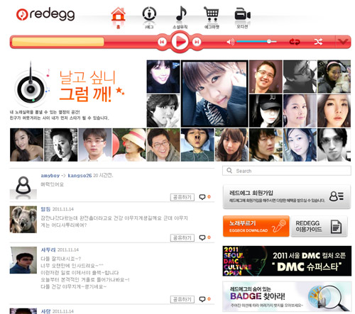 '레드에그'는 이용자가 반주(MR)에 맞춰 노래를 부르고, 곡을 녹음해 UCC(사용자제작콘텐츠)로 만들거나 다른 이용자들과 공유할 수 있는 기능을 제공하는 웹 소셜네트워크서비스(SNS)다. 말이 아닌 소리로 감정을 전하고 노래 실력도 뽐낼 수 있는 독특한 SNS다.