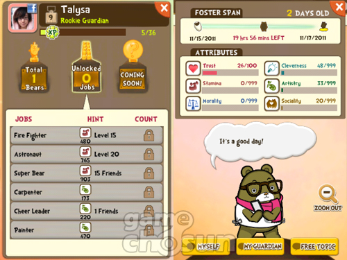 일만 시켜서는 곰과 친해질 수 없으니 항상 자주 놀아주고 돌봐줘야 합니다. 더러워졌을 때 문질러 씻겨주거나 배고플 때 음식을 주고, 졸릴 때 재우는 건 기본입니다. 곰의 배를 간질간질 문지르거나 좌우로 흔들고, 별 밖으로 쭉 밀어내듯 터치해 공중으로 내동댕이(?)치며 놀아줄 수 있습니다.