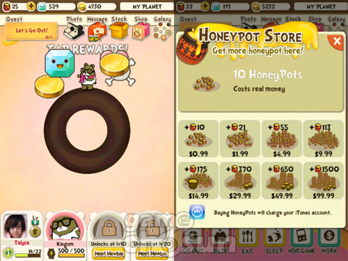 일하고 돌아와 배고픈 곰에게 밥을 먹이고 예쁜 옷으로 꾸며주려면 골드(게임 내 화폐)가 필요합니다. 또, 나만의 도넛 별을 멋지게 가꾸는 데는 '해피젬'이, 캐시 아이템을 사는 데는 '꿀단지'가 각각 들어갑니다.