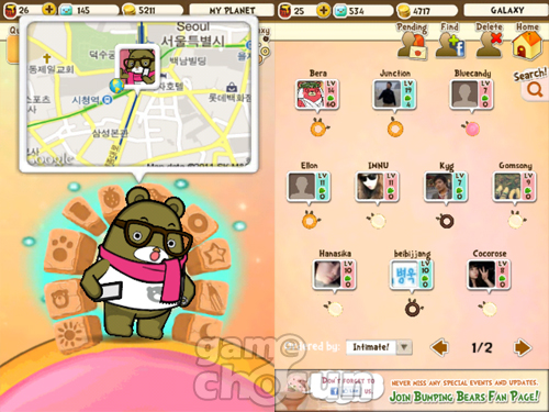 이 게임도 여타 SNG와 마찬가지로 친구가 많을수록 유리합니다. '해피젬' 모으기도 쉽고, 서로 선물을 주고 받거나 곰을 돌봐주며 도움을 주고 받을 수 있습니다. 새 친구를 추가하려면 페이스북 친구 중 '범핑베어' 이용자를 부르거나 외출하기를 통해 등록하면 됩니다.