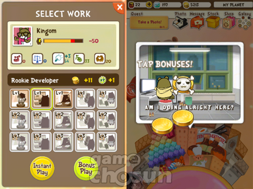 아르바이트는 실행 후 그냥 내버려둬도 되는 인스턴트 모드, 화면을 스쳐 지나가는 보상을 터치해 추가 보상을 얻는 보너스 모드로 나뉩니다. 심심할 때는 보너스 모드도 좋은 미니게임이 됩니다.