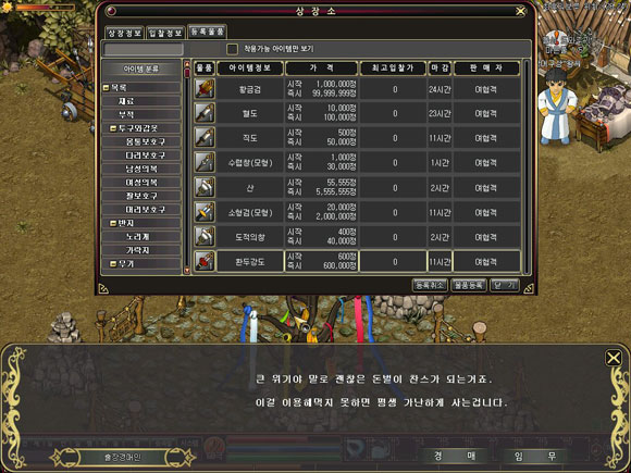 반면 경매장은 다양한 종류의 아이템을 분류 별로 판매할 수 있고, 구입할 수 있는 편리한 곳으로 주요 마을의 NPC를 통해 이용할 수 있다.