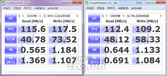 <좌측이 1TB WD HDD, 우측이 모멘터스XT 750G. 기본 HDD 성능은 비슷한 수준>