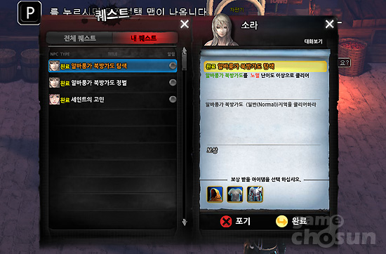 퀘스트 보고도 간단하다. 퀘스트가 완료 후 마을 어디서나 퀘스트 창을 열고 퀘스트 보고가 가능하며 보상도 바로 받으면 된다.