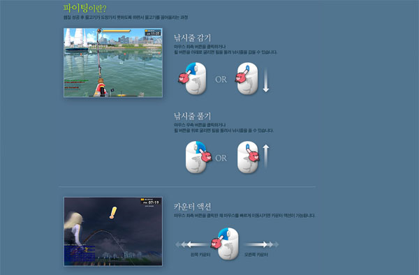 챔질에 성공해 물고기와 '파이팅'이 시작되면, 마우스 좌측(줄 감기) 버튼과 우측(줄 풀기) 버튼을 통해 물고기의 힘을 빼놓자. 이 동작은 마우스 휠을 아래로 내리거나(줄 감기) 위로 올려도(줄 풀기) 가능하다.