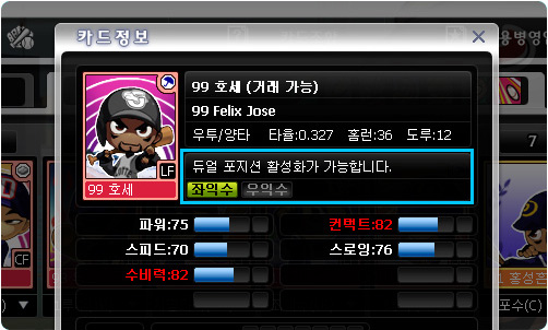 듀얼포지션은 한 선수카드가 하나의 포지션만 소화내 내고, 다른 포지션으로는 사용이 불가능 했던 부분을 해소시킨 것이다. 여기에 듀얼포지션을 갖게되는 선수들은 실제로 한 포지션이 아닌 다양한 포지션을 겪어본 경험이 있으며, KBO의 연간 포지션별 데이터를 이용해 사실성을 높였다.