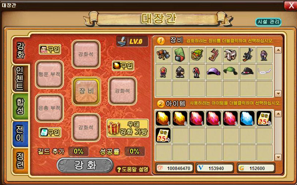 길드 대장간에서는 최저 10%에서 최고 100%로 강화 합성 성공률을 높여주는 혜택을 제공받는다. 일정 레벨에 도달하면 성공률과 추가 속성 효과도 받을 수 있다.