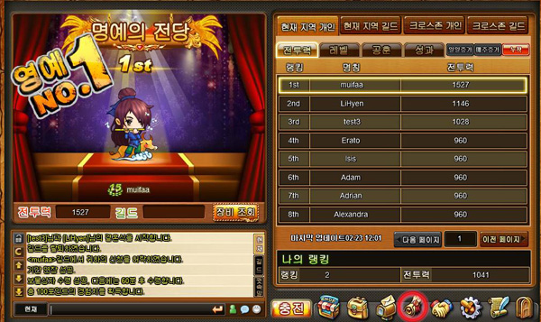 그 중 성과 시스템은 특정 레벨부터 정해진 목표를 달성했는지 여부를 기록해주는 것으로, 목표를 달성할 때마다 '칭호'를 지급하고 '명인당'이라는 공간에 결과를 입력해준다. '명인당'에서는 여러 캐릭터의 성과를 순위로 정리해 보여준다.
