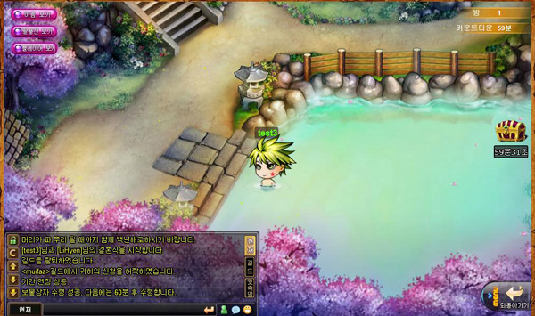 온천 시스템은 친구들을 초대해 잠시 휴식을 즐길 수 있는 시스템이다. 온천 방에 들어가면 1분 마다 일정 경험치가 상승하고, 최대 1시간 동안 이용 가능하다.