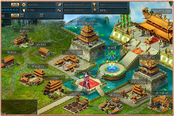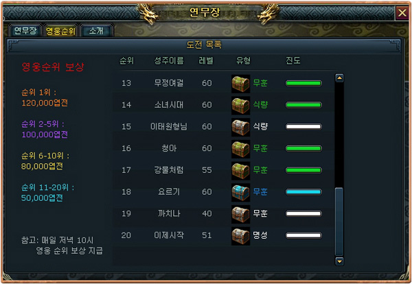 이 중 PvP 시설인 '연무장'은 10분마다 명성, 엽전, 금화, 무훈, 식량 등의 보물상자가 모두 지급되는 곳이다. 매일 밤 10시에는 연무장 순위에 따라 보너스 상금도 차등 지급된다. 때로는 희귀한 '금화 상자'가 나오기도 한다.