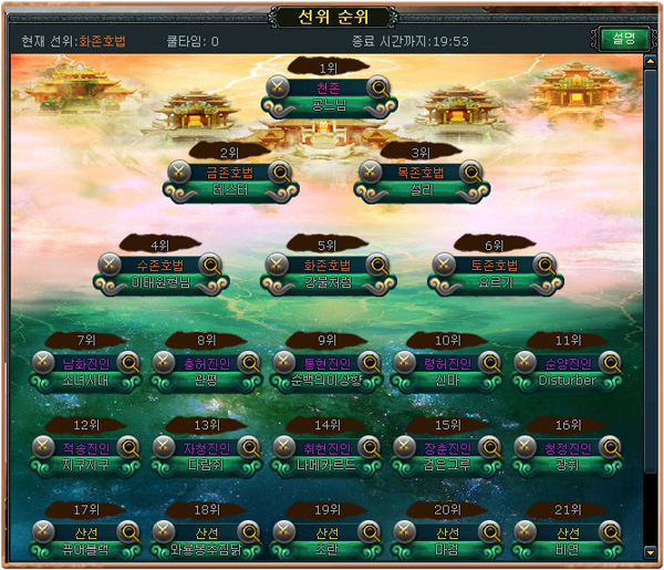유저는 같은 진영 내에서도 '천존'의 자리를 두고 경쟁을 하게 된다. '지나인'에는 일종의 계급 싸움인 '천존쟁탈전'이 있다. '천존쟁탈전'은 정해진 날짜와 시간에만 진행되며, 마감 즉시 각 순위와 직책에 따라 보상금이 차등지급된다.